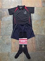 shirt - black, shorts black/navy, socks red/black /white